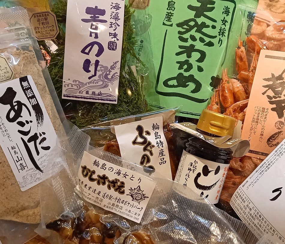 와지마를 대표하는 해산물. 천연 미역, 돌김을 비롯해 어간장(이시리)과 날치육수(아고다시) 다시팩도 인기입니다. 미치노에키 센마이다의 한정 해산품도 있습니다.