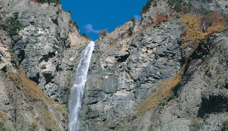 데도리가와 강의 급류가 만든 아름다운 협곡으로, 약 8킬로에 걸쳐서 높이 20~30미터의 절벽이 이어집니다. 그중에서도 32미터의 절벽에서 목화가 흩날리듯 물보라가 협곡으로 낙하하는 "와타가타키 폭포"의 경관은 박력 넘칩니다.