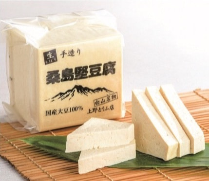 This firm tofu is made in the same traditional methods as in the past, taking time and care. The hand-made tofu brings out the natural sweetness of the soy beans. Cut into slices for sashimi or miso dengaku, or tofu steaks are also recommended.