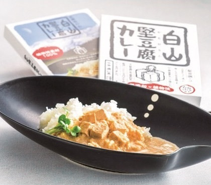 Curry with firm tofu, a specialty of Hakusanroku. The white curry, which uses plenty of healthy local ingredients such as firm tofu, silken tofu, soya milk, rice flour and sake lees, is rich in spiciness and flavour.