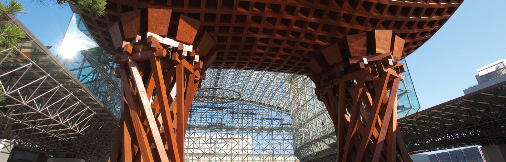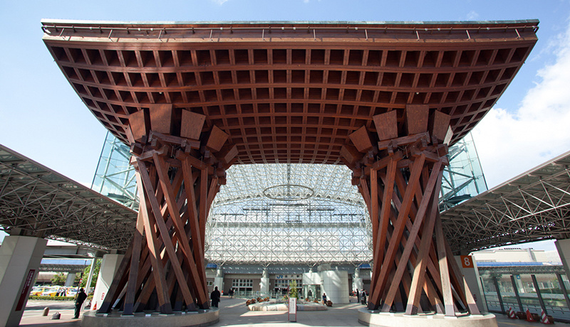 A famous American travel magazine “TRAVEL+LEISURE” selected Kanazawa station in 2011 as one of the most beautiful stations in the world. The station honorably has two mandatory shooting spots. One is “Tsudumi-mon” made from wood, which models on Japanese hand drums (Tsudumi) for Nohgaku theatre. Another one is a huge glass-walled “dome of Motenashi”, which means hospitality in Japanese.